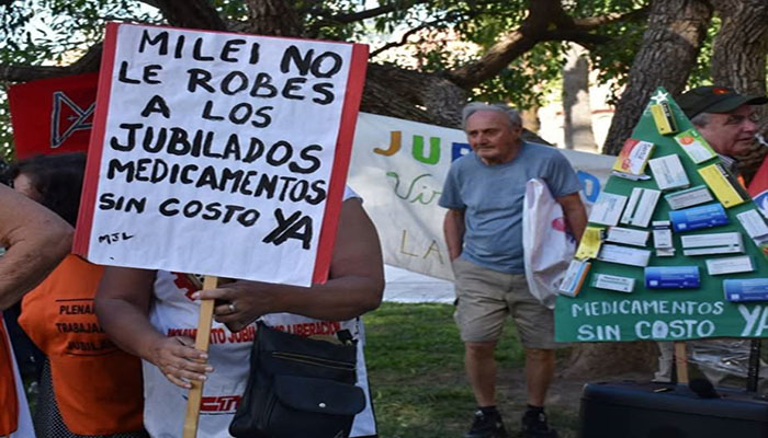 El brindis con agua de lxs jubiladxs en Plaza de Mayo frente a un arbolito adornado con las cajas de los medicamentos esenciales que dejaron de tener la cobertura sin costo del PAMI es toda una postal navideña de la Argentina actual.