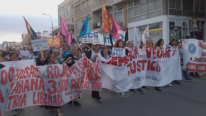 Después tuvo lugar la marcha que, como es tradicional, contó con la organización de la Cátedra de Derechos Humanos de la Universidad Nacional de la Patagonia San Juan Bosco, en cuyo contexto se hizo una radio abierta y se leyó un documento conjunto. “Fue una marcha de unidad”, recalcó Elena González, que estuvo entre quienes participaron recorriendo distintas arterias hasta llegar al destacamento de Prefectura Naval donde durante la dictadura funcionara un Centro Clandestino de Detención y, desde ahí, se dirigieron hacia la sede de la Seccional Primera de la Policía donde también hubo un Centro Clandestino, pero además es el lugar en el que fue visto por última vez Iván Eladio Torres Millacura, quien tenía 25 años cuando fue secuestrado y desaparecido el 2 de octubre de 2003.