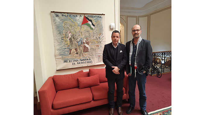 El embajador palestino, Riyad Alhalabi, recibió a una delegación del Partido Comunista de la Argentina encabezada por su secretario de Relaciones Internacionales Marcelo Rodríguez, quien recalcó que “lo más importante en este momento es frenar el genocidio que se lleva adelante en Gaza”.