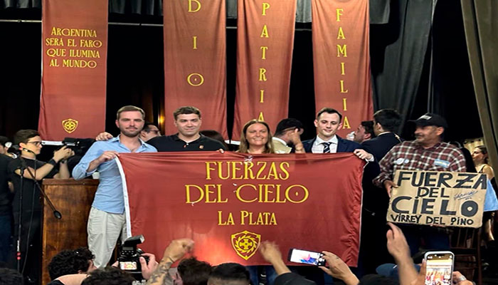 “El acto lanzamiento de Las Fuerzas del Cielo, que tuvo lugar en la Sociedad Italiana de San Miguel con una escenografía nazi-fascista cuidadosamente montada, no es ningún hecho político aislado ni marginal: se inscribe en un clima de época que con iniciativas como esta buscan seguir radicalizando desde el poder real”, advirtió el Secretariado Nacional del Partido Comunista por medio de una declaración en la que convoca a construir “una alternativa antiimperialista contra el proyecto neocolonial de Milei y los monopolios”.