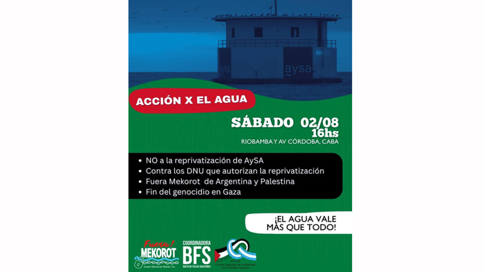 La defensa del agua, contra la privatización, y la solidaridad con el pueblo palestino se unirán este sábado en las calles de Buenos Aires en una movilización convocada para defender a AySA de la privatización y rechazar el posible desembarco de Mekorot en el área metropolitana. La marcha, que partirá desde Avenida Córdoba y Riobamba hasta Plaza de Mayo a las 16 horas, es convocada entre otras organizaciones por el Comité Argentino de Solidaridad con el Pueblo Palestino.