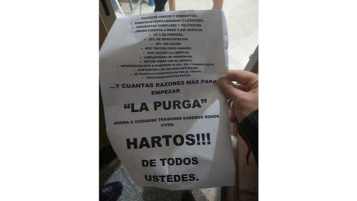 El panfleto habla de “empezar la purga”, frase que asociada a la explosión es absolutamente explícita sobre las intenciones de quienes perpetraron el atentado.