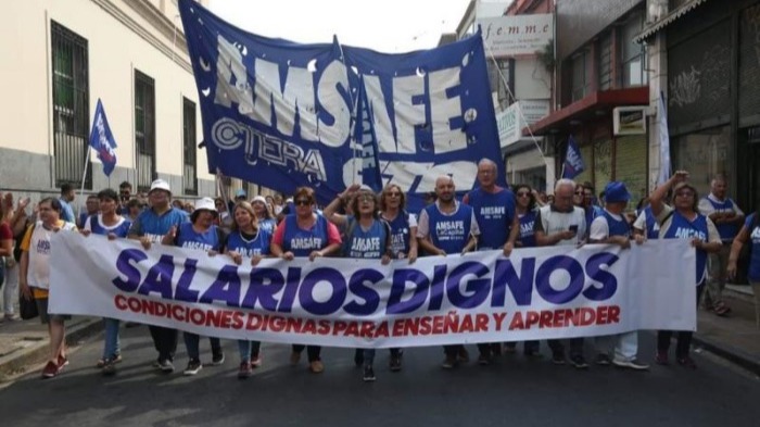 “Repudiamos cualquier intento de reforma de la ley provincial de jubilaciones”, dijo desde La Violeta, la integrante de Amsafé, Maru Regue, quien tras advertir que el gremio está en estado de alerta, fue clara cuando sostuvo que “si sube la edad jubilatoria, tendremos compañeros docentes trabajando con más de 65 años, algo que pone como eje de debate nuestras paupérrimas condiciones laborales”.